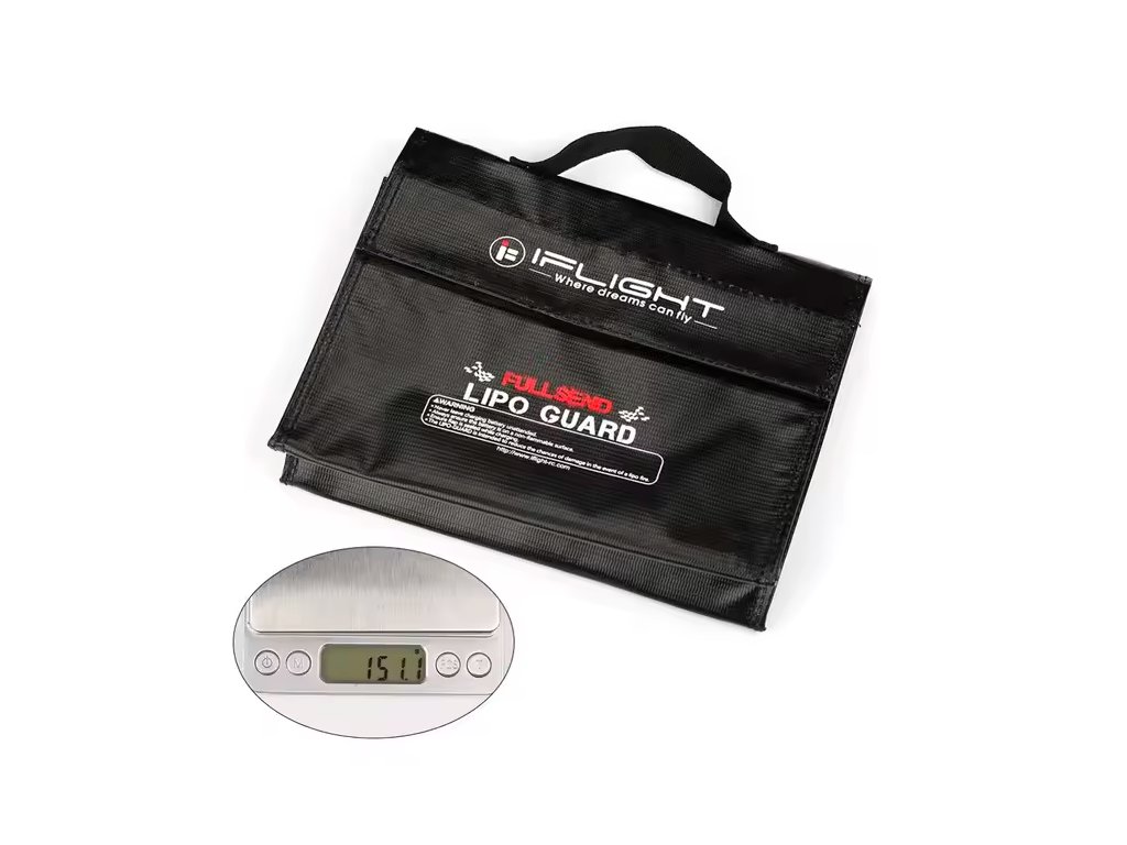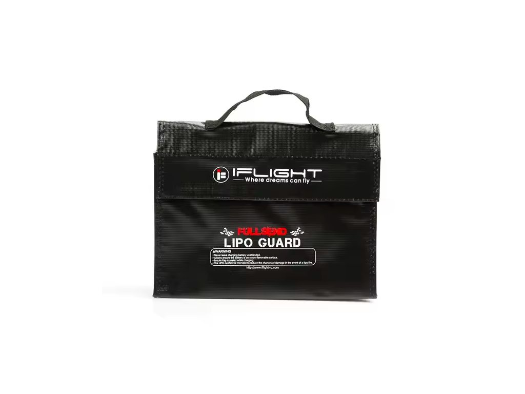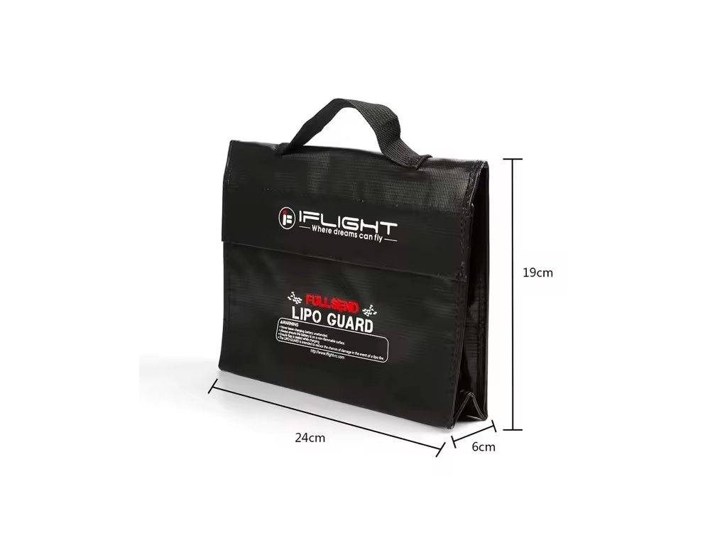 Battery Safety Bag iFlight 24x9x16cm The iFlight Explosion-proof Battery Handbag is designed to safely store and charge LiPo batteries, helping reduce risks during use. Made from heat-resistant material, it provides an additional layer of protection against fire and explosion, making it an essential safety accessory for FPV pilots. Features: - Designed to improve safety during LiPo battery charging and storage - Heat-resistant construction for enhanced protection - Explosion-proof design to help limit damage - Compact size suitable for small to medium LiPo batteries - Secure flap closure for safer charging conditions Specification: Brand Name: iFlight Material: PVC Size: 24x9x16cm Color: Black Protection Type: Heat resistant, explosion proof Package Include: 1x Battery Safety Bag iFlight 24x9x16cm