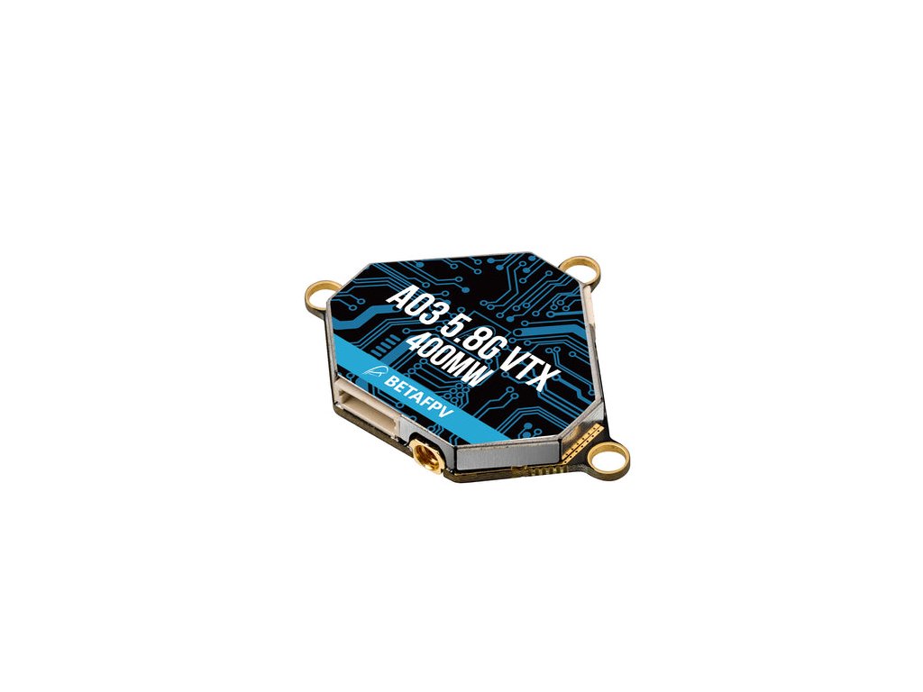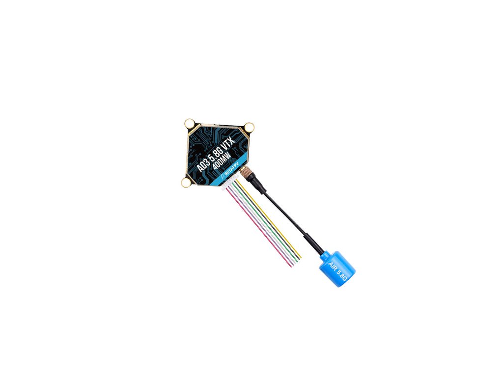A03 25-400mW 5,8G VTX A03 400mW 5.8G VTX, video vysílač s firmwarem OpenVTx, podporuje protokoly SmartAudio i Tramp. Je vybaven PIT/RCE/25mW/100mW/400mW nastavitelným výstupním výkonem pro různé použití. Díky velikosti montážního otvoru 26 x 26 mm je vhodný pro drony typu wop nebo párátka, jako je řada X-Knight, řada Beta85X/95X, řada TWIG a řada Pavo. Specifikace: Položka: A03 5.8G VTX Výstupní výkon: PIT/RCE/25mW/100mW/400mW (10-26dBm) Rozsah napájecího napětí: 7-35V Proud (8V): <300mA (400mW) Hmotnost: 4,9 g (bez antény) Velikost VTX: 30,34 x 30,34 x 4,6 mm Velikost montážního otvoru: 26 x 26 mm Anténa: Vzduchová anténa (MMCX Straight) Frekvence: 5,8 GHz 48 kanálů Závodní pásmo: 5658-5917 MHz VÝBĚR kanálu: SmartAudioV2.0 & Tramp Typ modulace: FM Anténní port: 50 Provozní teplota: -10℃ - +60℃ Doporučené drony: montážní otvor 26 x 26 mm, řada Pavo, řada X-Knight, řada Beta85X/95X a řada TWIG