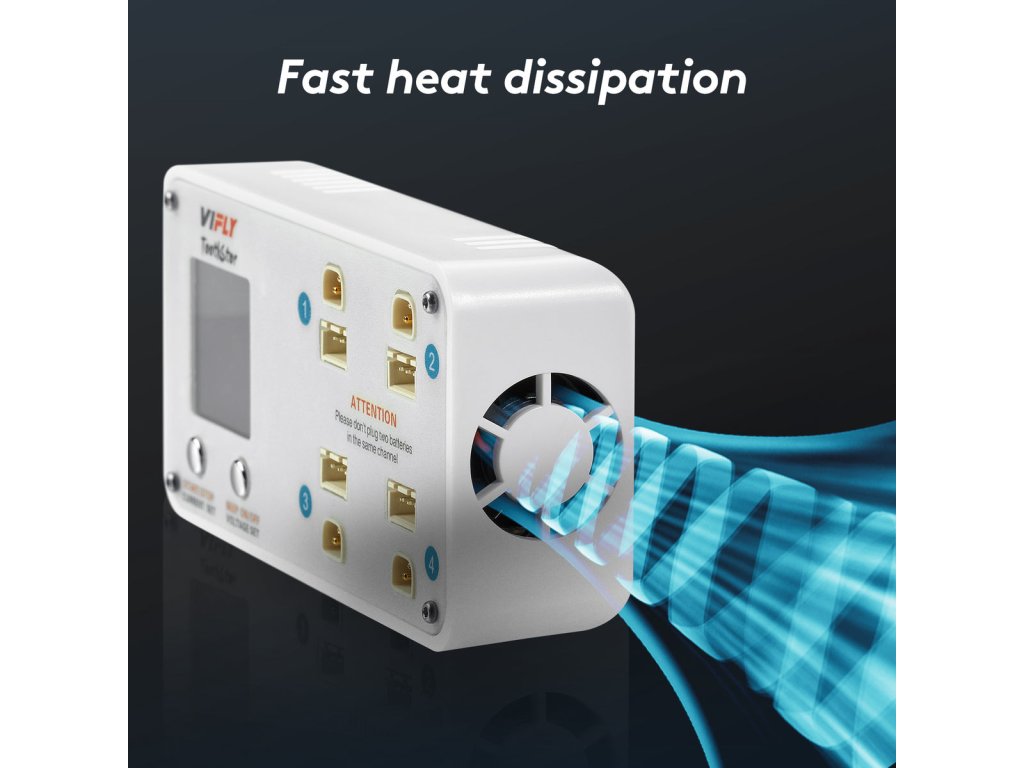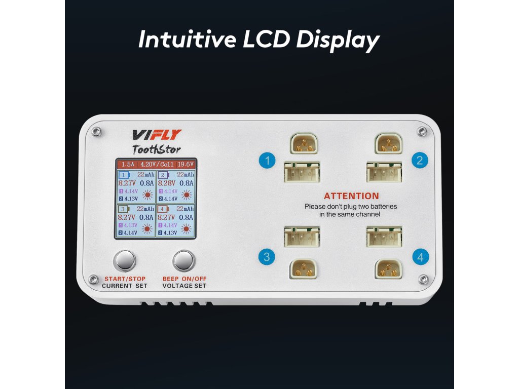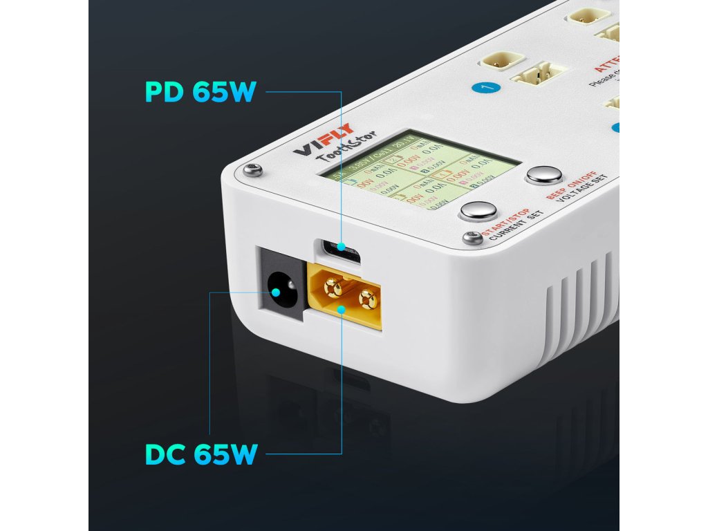 VIFLY ToothStor - 4portová nabíječka 2S Balance s režimem skladování Vlastnosti: - Nabíječka se 4 porty 2S Balance Charger s režimem ukládání. Můžete nabíjet čtyři 2S baterie současně. A jsou to 4 nezávislé nabíjecí kanály, není nutné zajistit, aby všechny baterie měly stejné napětí nebo stejnou velikost. Kromě nabíjení baterií na plné napětí je můžete nabíjet nebo vybíjet na skladovací napětí pro dlouhodobé skladování. - Barevný displej LCD, intuitivní rozhraní. VIFLY ToothStor instaluje vysoce kvalitní LCD displej, stav nabíjení je zobrazen jasně a intuitivní rozhraní velmi usnadňuje ovládání. - Nabíjení pouze prostřednictvím standardního vyrovnávacího vodiče. VIFLY ToothStor nabíjí baterie pouze prostřednictvím standardního vyrovnávacího kabelu (JST-XH2,54), což pohodlně eliminuje potřebu připojovat napájecí kabel, jako je XT30, T-zástrčky atd. - Silná schopnost odvádět teplo Ventilátor a velký chladič by účinně odváděly teplo, aby se zabránilo přehřátí jednotky. To výrazně zvyšuje účinnost a rychlost vybíjení. - Více vstupů napájení. Podporuje typ C, XT60 a stejnosměrný vstup napájení. Typ-C podporuje protokol PD3.0, který vyžaduje, aby vstupní výkon byl vyšší než 65 W. - Paměťová funkce. VIFLY ToothStor měl paměťovou funkci zapamatování posledního nastavení, není třeba nastavovat nabíjecí proud při každém zapnutí. - Indikace bzučákem. VIFLY ToothStor přidal bzučák, který pípne, když skončí jeden nabíjecí okruh, pokud se vám pípání nelíbí, můžete bzučák ručně vypnout. Specifications: Rozměry: 109x56x30 mm Hmotnost: 142 g Vstupní konektor: XT60, DC(5,5*2,1mm), USB-C(PD3.0) Rozsah vstupního napětí: 10V-26V Minimální vstupní výkon: 65 W Maximální nabíjecí proud: 1,5 A/port Podporovaný konektor baterie: XH2.54 3Pin a BT3.0. Typ baterie: LiHV / LiPo Úložné napětí: 3,80 V/článek a 3,85 V/článek Maximální vybíjecí proud: 0,2 A/port Vyvažovací proud: 0,2A Balení obsahuje: 1x VIFLY ToothStor - 4 portový 2S Balance Charger