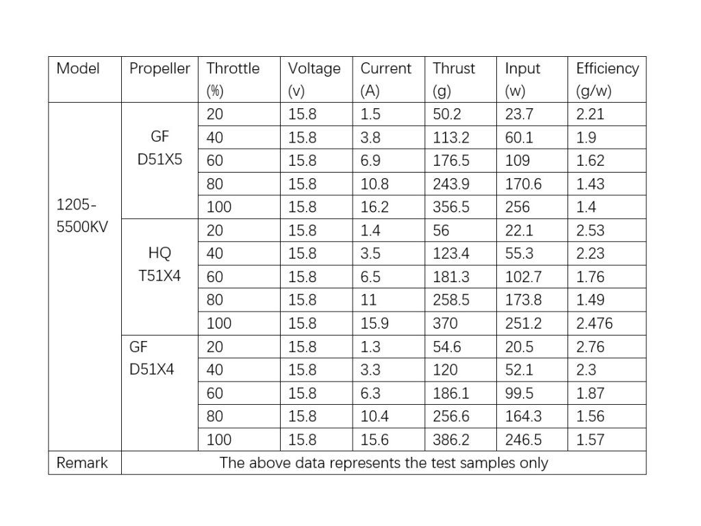 Motor 1205 5500KV má konfiguraci 9M12P, využívající statorové magnety N52H pro vyšší účinnost. Má stator o průměru 12 mm a délce 5 mm, s celkovými rozměry motoru 16,75 mm v průměru a 13,83 mm na výšku. Motor je vybaven silikónovým kabelem o délce 100 mm a hmotnosti 9 gramů. Dále může být namontován pomocí konfigurace 9 x 9 mm (M2).