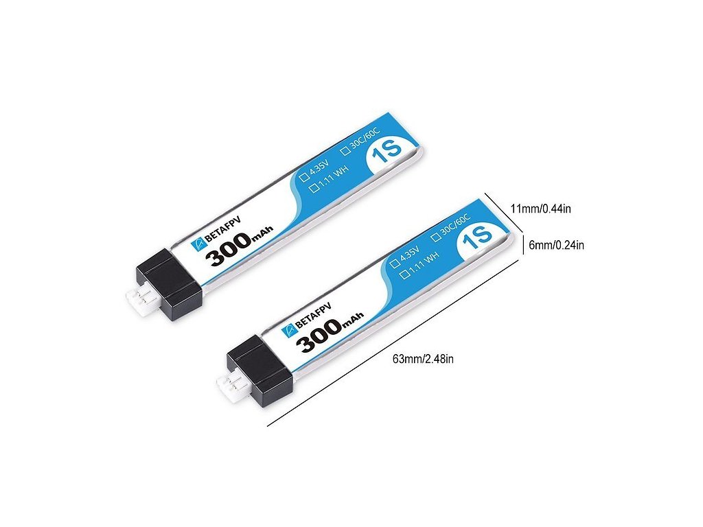 300mAh 1S 30C HV Akku (8 Stück) Der verbesserte PH2.0 300mAh 1S-Akku wurde für Beta65&75 Pro 1S / Beta65&75 Pro 2 entwickelt und bietet mit seiner beeindruckenden Entladerate von 30C/60C hervorragende Flugzeiten. Dieser verbesserte 300mAh 1S-Akku bietet eine längere Entladezeit im Vergleich zu seinem Vorgänger, was eine verbesserte Beschleunigung und eine bessere Kontrolle des bürstenlosen Whop während des Fluges ermöglicht. Spezifikationen: Akku 1S Kapazität: 300mAh Rate: 30C/60C Spannung: 4,35 V Abmessungen: 63x11x6mm Anschluss: JST-PH2.0 Gewicht: 8,3 g Verpackung: 8 x 300mAh 1S 30C HV Akku