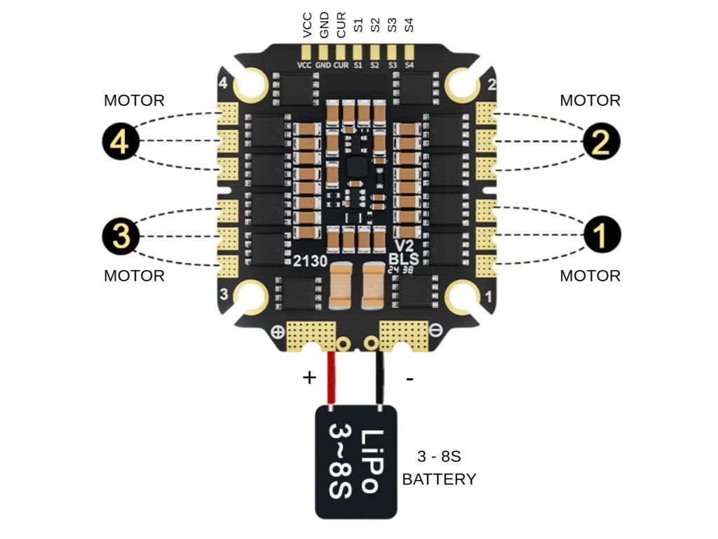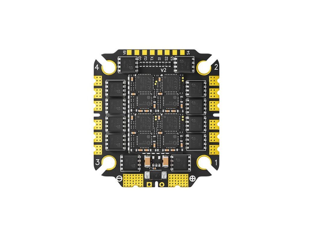 Dieser Geschwindigkeitsregler nutzt ein 4-in-1-ESC-Design und umfasst verschiedene Protokolle, einschließlich DShot150, DShot300, DShot600, Multishot und OneShot, was vielseitige Kompatibilität gewährleistet. Er unterstützt auch bidirektionales DShot für eine verbesserte Datentransmission. Das Gerät verfügt über Telemetrieunterstützung zur Überwachung von RPM, Strom, Spannung und Temperatur und ist für die Installation mit Lötpads für die Strom- und Motoranschlüsse ausgelegt.