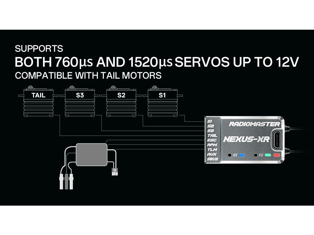 FC RadioMaster Nexus-XR Hubschrauber mit Empfänger Rot Der Nexus-XR revolutioniert Hubschrauber-Flugsteuerungen durch die Integration eines hochmodernen ExpressLRS-Empfängers mit zwei Semtech SX1281 2,4-GHz-Transceivern. Dieser integrierte Empfänger bietet eine außergewöhnliche HF-Leistung, überragende Reichweite, Zuverlässigkeit und mühelose Einrichtung. Er macht externe Empfänger überflüssig, vereinfacht die Installation und reduziert das Gewicht. Das Herzstück des Nexus-XR ist der leistungsstarke STM32F722-MCU, der mit dem 6-Achsen-MEMS-Bewegungserfassungsgerät ICM42688P kombiniert ist. Dieses Gerät bietet eine hervorragende Vibrationsfestigkeit und verbesserte Signalunterdrückung und ist somit ideal für Elektro- und Nitro-Hubschrauber geeignet. Der Nexus-XR verfügt über mehrere wichtige Verbesserungen. Ein verbessertes BEC liefert eine stabilere Stromversorgung für die Elektronik und erhöht damit die Zuverlässigkeit, während der externe Spannungseingang nun einen Bereich von 3,6 V bis 70 V unterstützt. Der Speicher wurde auf 256 MB aufgerüstet, was längere Flugprotokolle ermöglicht. Das CNC-gefräste Aluminiumgehäuse ist schlanker und dient dennoch als Schutzschild und Kühlkörper, der das System auch bei intensiven Flügen kühl hält. Der Nexus-XR wurde für ultimativen Komfort entwickelt. Seine kompakte, robuste Bauweise passt für eine Vielzahl von Hubschraubergrößen und liefert auch unter anspruchsvollen Bedingungen Spitzenleistung. Merkmale: - Integrierter ExpressLRS-Empfänger: Zwei Semtech SX1281 2,4-GHz-Transceiver für nahtlose RF-Leistung, wodurch ein externer Empfänger überflüssig wird. - Optimiert für Rotorflight 2.2: Entwickelt für Spitzenleistung und Kompatibilität. - Präzise Steuerung: STM32F722 MCU und ICM42688P 6-Achsen-Gyroskop/Beschleunigungsmesser für überragende Flugdynamik. - Flugprotokollierung: 256 MB integrierter Flash-Speicher für detaillierte Protokollierung und Abstimmung. - Dual-Antennen-Design: Zwei 65-mm-Drahtantennen für überragende Signalstärke und Reichweite. - Vielseitige Konnektivität: Mehrere UART-Ports unterstützen CRSF, ELRS, S.BUS und mehr. - Mehr PWM-Pins: Zusätzliche Pins für erweiterte Steuerung in komplexen Setups. - CNC-gefrästes Aluminiumgehäuse: Das schlanke, robuste Design dient gleichzeitig als Kühlkörper, um das System kühl zu halten. - Unterstützung für Heckrotorservo/ESC: Kompatibel mit 760-μs-/1520-μs-Heckrotorservos und ESCs. - 12-V-Servo-Unterstützung: Unterstützt 12-Volt-Servos. - Großer Spannungsbereich: Unterstützt externe Spannungsversorgung von 3,6 V bis 70 V für flexible Konfigurationen. - Verbessertes BEC: Stabile, zuverlässige Stromversorgung der Elektronik für verbesserte Leistung. - Isolierte Stromversorgungen: Spezielle 1,8 V (Gyro), 3,3 V (MCU) und 5 V (Schnittstellen) zur Minimierung von Störgeräuschen. - USB-C-Zugänglichkeit: Leichtes, flexibles USB-C-Verlängerungskabel für einfachen Zugang in beengten Bauten. - Kompakt und leicht: Ideal für alle Hubschrauberkonstruktionen. - Rotorflight Rescue: Standardfunktion für erhöhte Sicherheit in Notfällen. - Gehäusefarbe: Rot Technische Daten: Artikel: Nexus-XR Hubschrauber-Flugsteuerung Firmware: Rotorflight 2.2 MCU: STM32F722RET6 Gyro (IMU): ICM42688P Flash-Speicher (Black Box. IC): 256 MB (W25N02KVZEIR) Barometer: SPL06-001 Uart: 5 – S.BUS[UART1], TELEM[UART2], PORT-A[UART4], PORT-B[UART6], PORT-C[UART3] Servo: S1, S2, S3, TAIL Servos (bis zu 12 V) Drehzahlsensor: 1 – VON ESC-FREQUENZ-SENSOR AUX: 1 Externer Spannungseingang (Tele): 3,6–70 V Empfängerunterstützung: CRSF, ELRS, GHOST, S.BUS, SUMD, IBUS, XBUS, EXBUS, PPM, MSP Spannungsversorgung (DC): 5–16 V A-B-C-Serieller Anschluss Ausgangsleistung: 5 V – 1,5 A Telemetrie: S.BUS, HoTT, S.Port, MSP, EDGETX, ELRS ESC: PWM, Oneshot, Multishot, Dshot Unterstützt Heck-ESC: 760 μs / 1520 μs Servo Unterstützt Heckmotor: Ja Interner Empfänger: RP4TD-M ExpressLRS 2,4 GHz Mini-True-Diversity-Empfänger MCU: ESP32 Typ: ISM RF-Chip: SX1281 x 2 Antenne: 65 mm 2,4 GHz Drahtantenne x 2 Frequenzbereich: 2,4 GHz Maximale Bildwiederholfrequenz: 500 Hz / F1000 Hz Telemetrie-HF-Leistung: max. 2 x 10 mW WLAN-Updates: Ja FW-Ziel: RadioMaster RP4TD-M 2400 RX Bus-Schnittstelle: CRSF Abmessungen: 44,70 x 26,50 x 14,30 mm Gewicht: 24,1 g Lieferumfang: 1x NEXUS-XR Hubschrauber-Flugsteuerung 3x JST-GH 4-adrige Pigtail-Kabel 1x JST-GH-zu-Servo-Stecker (3-poliger Dupont-Stecker) 1x ultraleichter und flexibler USB-C-Verlängerungskabel 1x Typ C-Verlängerungskabel 1x JST-ZH1.5 „DSM”-Telemetriekabel (Telemetrie unterstützt keine DSM-Empfänger) 1x Spannungstelemetriekabel 3x doppelseitiges 3M-Klebeband 2x Schrumpfschlauch 1x Inventarkarte