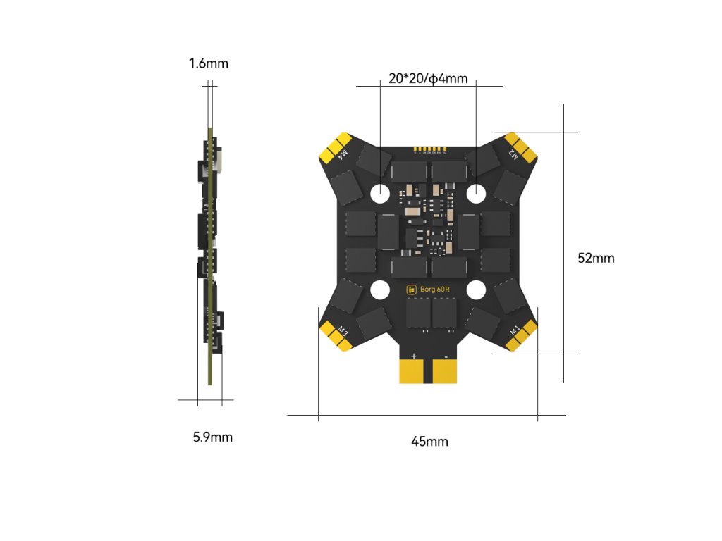 Stack iFlight Borg 5S RX Stack (Borg 60R ESC) Der iFlight Borg 5S RX Stack ist ein leistungsstarker All-in-One-Rennstack, entwickelt für hochdynamische FPV-Performance. Dieses System kombiniert einen Flight Controller mit integriertem 2,4-GHz ExpressLRS (ELRS) Empfänger und Antenne für extrem verlässliche Signalübertragung. Der Borg 5S RX FC unterstützt 4–8S Eingangsspannung und kann bei Bedarf externe Empfänger aufnehmen. Der beiliegende Borg 60R ESC liefert bis zu 60 A Dauerstrom und unterstützt DShot sowie Telemetrie. Mit modernen Komponenten wie dem AT32F435 MCU, ICM42688 Gyro und robusten 12V/5V BECs ist dieser Stack optimiert für niedrige Latenzen, minimalen Störgeräuschpegel und höchste Rennanforderungen. FC-Spezifikationen: Eingangsspannung: 4–8S; unterstützt LiHV-Akkus MCU: AT32F435RGT7 Gyro: ICM42688 Barometer: Nicht vorhanden OSD-Chip: AT7456E Flash: 16 MB (Blackbox-Flash) UARTs: 4 Motor-Ausgänge: 4 I2C-Serial: Nicht unterstützt VTX-Protokolle: DJI MSP / SmartAudio / IRC Tramp / HDZero LED-Controller: Ja Beeper-Pad: Ja Firmware-Ziel: IFLIGHT_BLITZ_ATF435 (Betaflight) Montagemuster: 20×20 mm, Φ4 mm Abmessungen: 34×27 mm ±1 Gewicht: 6,8 g ±1 BEC-Ausgang: 5 V 2,5 A, 12 V 2 A (12 V mit VTX-Schalter) ESC-Spezifikationen: Produktname: Borg 60R ESC Eingangsspannung: 3–8S; unterstützt LiHV-Akkus Max. Dauerstrom: 60 A Max. Spitzenstrom: 65 A (10 s) MCU: STM32G071N Treiber: FD6288 Firmware: BL32 (32 Bit ESC) Ziel: IFLIGHT_BLITZ_G3 32.9 Stromsensor: Nicht vorhanden BEC: Nicht vorhanden Telemetrie: Unterstützt Bidirektionales DShot: Unterstützt Abmessungen: 45×52 mm ±1 Montagelöcher: 20×20 mm / Φ4 mm Gewicht: 14,5 g ±1 Protokolle: Unterstützt DShot150/300/600, MultiShot, OneShot etc. Lieferumfang: 1 × Borg 60R ESC 1 × Borg 5S RX Flight Controller 1 × Kabelsatz 5 × Silikondurchführungen