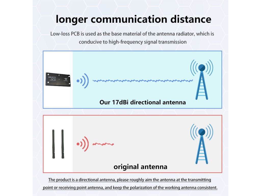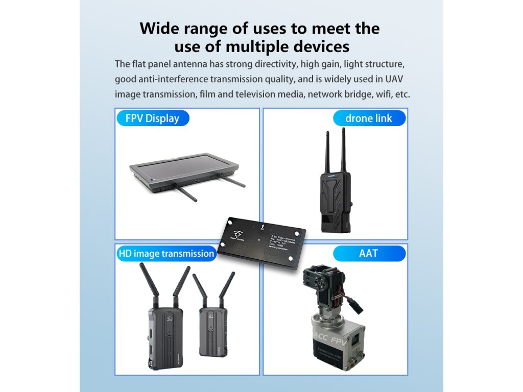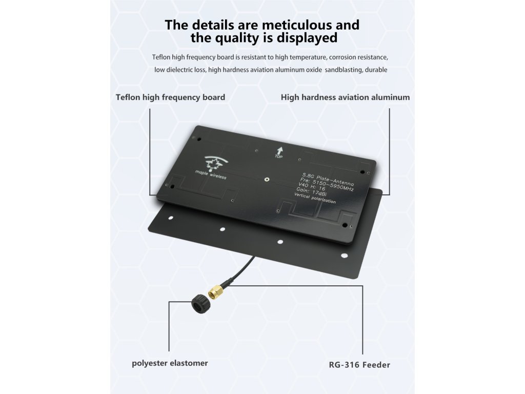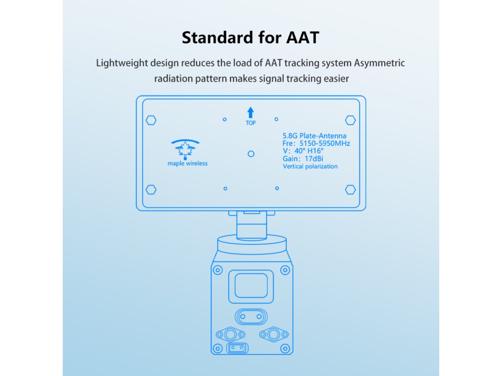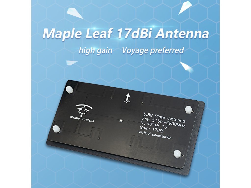 17dB directional antenna (SMA-AAT) The Maple 5.8G-17dB antenna is a high-gain directional antenna that is vertically polarized when the antenna is used parallel to the ground. The corresponding transmitting rod antenna also needs to be used vertically on the ground. After the increase of antenna gain, the horizontal azimuth Angle of the antenna is relatively narrow, about 16°, which has high requirements for users and is more suitable for long-distance or supporting closed-loop AAT work. Specifications: Frequency: 5.8G Gain: 17dBi Bandwidth: 5180-5950MHz Size: 136*68*10mm Package includes: 1x 17dB directional antenna (SMA-AAT)