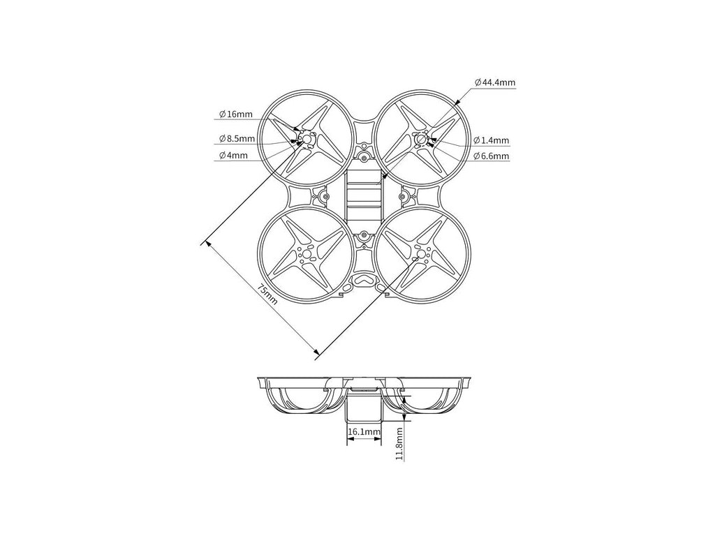 Beta75X 2-3S Whoop Frame (V2, black) Compared with the Beta75X frame, the Beta75X V2 frame only weighs 5.6g, It is lighter and the gravity center of the V2 frame is more concentrated. Increased the height of the frame loop, props can be completely wrapped by the protective ring. A better choice for a 75mm brushless whoop drone. What's more, the Beta75X V2 Frame is specially designed with two different motor mounting holes that support 1102 and 1103 brushless motors. With 26x26mm FC mounting columns can match whoop-style flight controllers like F4 AIO 12A FC. The battery slot fits BETAFPV 300mAh 2S and 300mAh 3S-S battery. Specification: Material: Plastic Color: Black Weight: 5.6g Wheelbase: 75mm Motor mounting hole: for 1102, 1103 series motors FC mounting hole: 26x26mm, fully compatible with whoop style FC board mounting pattern Battery slot size: 6.8x16.1mm Recommended Parts: Propellers: 40mm 4-blade props (1.5mm shaft hole) Motors: 110x brushless motors, like 1103 11000KV motors Battery: 3S 300mAh Battery / 2S 300mAh Battery FC & ESC: F4 1-2S AIO Brushless FC, F4 AIO 12A FC Package: 1 x Beta75X V2 Whoop Frame for 75mm 3S whoop drone