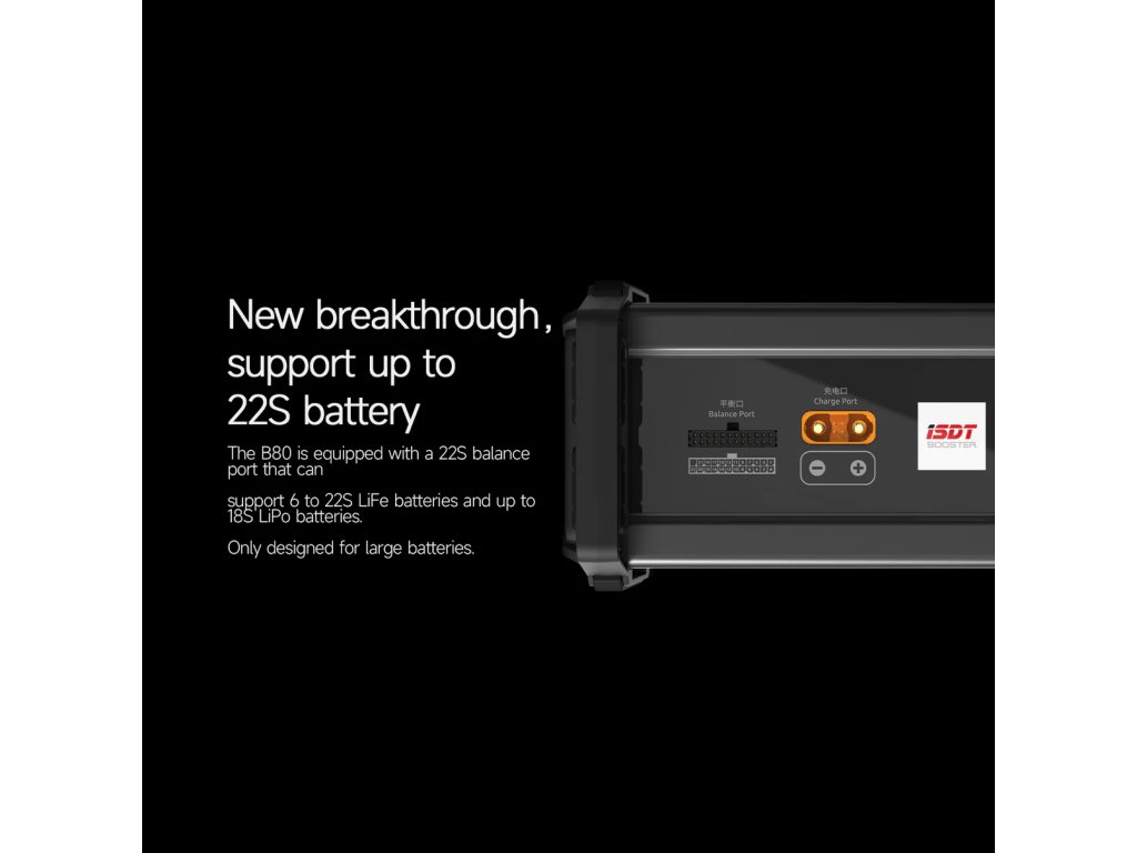 - Equipped with a 22S balance port, it supports LiFe batteries (8-22S) and LiPo batteries (6-18S), making it ideal for handling high-voltage, high-capacity battery systems.