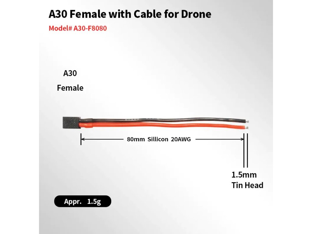 Upgrade your 1S micro drone with the FLYWOO A30-F high-current pigtail connectors, designed to replace PH2.0 connectors for enhanced performance. Each pigtail features 20AWG silicone wire at 80mm length, pre-soldered to durable A30 connectors that support up to 15A continuous and 30A peak current. With lower contact impedance and improved discharge capacity, A30 ensures better throttle response, longer flight times, and minimal voltage drop under load. Built with flame-retardant PA66 and brass-gilded contacts, these connectors are rated up to 500V and operate in temperatures from -20°C to 120°C. Ideal for ESC upgrades, chargers, and high-drain battery setups.