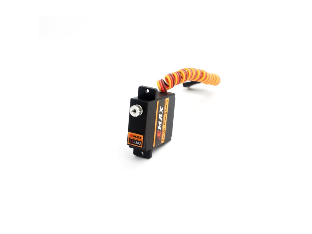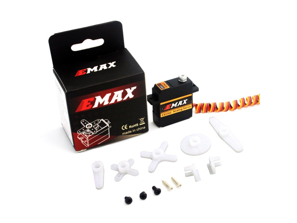 The ultra-thin Emax ES3302 (dual-bearing) analog servo with metal gear for RC glider airplanes. The NOBLE potentiometer assures high accuracy and coherence. Accessories include an arm and screw pack.
