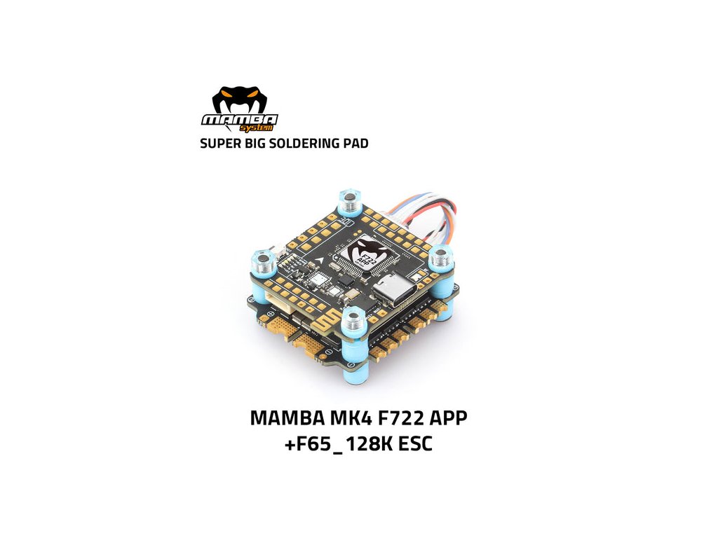 MAMBA F722 APP FC _F65_128K FC SPECIFICATIONS MCU: 216MHz STM32F722 GYRO: ICM42688P OSD: AT 7456E Blackbox: 16M Flash Memory Uarts: 6Set Receiver: TBS/SBUS/IBUS/DSM I2C: Yes F.Port: Yes Buzzer Pad: Yes CURR Pad: Yes ESC Signal: 8 set BEC 3.3V: 0.5V BEC 5V: 3A BEC 9V: 3A MB LED: Yes BF LED: Yes Air unit port: Yes WIFI: SpeedyBee APP VTX Switch: Yes BEC Protection: Yes Receiver protection: Yes TVS Protection: Yes Input: 6S Lipo Soft ware: Betaflight Mounting: 30.5x30.5mm/M3 Size: 38x40.5x8mm Weight: 10g ESC SPECIFICATIONS Input voltage: 3-6S Lipo Continue Current: 65A Burst: 75A BLHeli_32 Target: F65-128k Soft: Dshot300/600/1200 Mounting: 30.5mm/M3 PWM: 24-128k Package includes: 1x FC MK4 F722 APP 1x F65_128k ESC 5x Silicone damper M3 5x M3 ESC insulation column 1x 8pin single-ended cable for FC 2x 8pin cable 1x 6pin cable for air unit