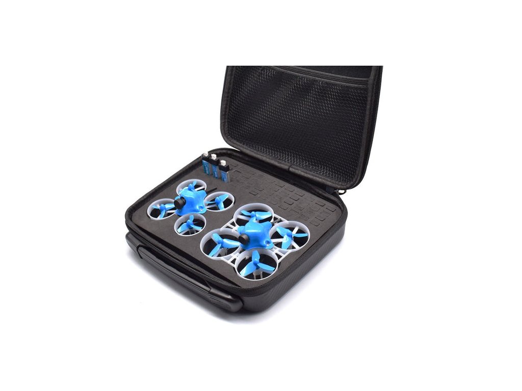 This handbag carrying bag is specially designed for the storage and transport of mini whoop drones. The waterproof outer case provides comprehensive protection against scratches, dust, dirt, and impact. With custom foam slots, it accommodates two whoop drones simultaneously, ensuring a snug fit. The dual zip closure enhances security, safeguarding the drone during transit. The interior boasts a netted storage compartment for additional accessories.