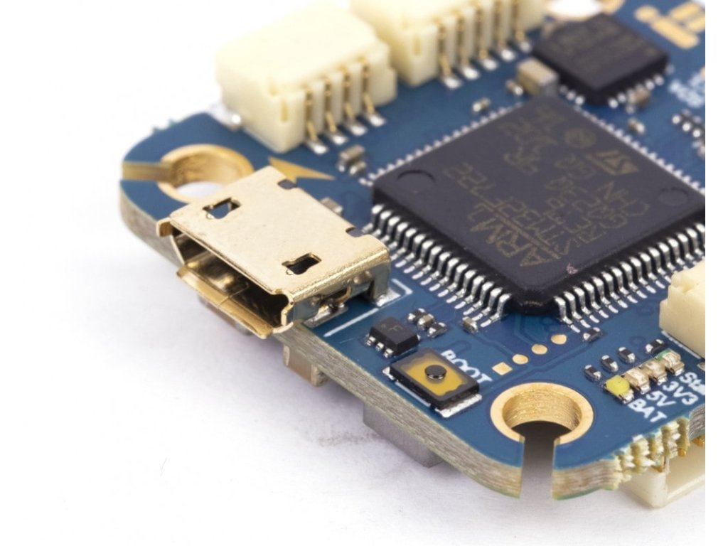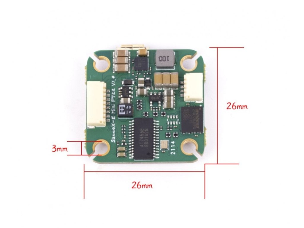 SucceX-E Mini F722 V1.4 2-6S Flight Controller Features: - Gold-plated plug - BlackBox: 16MB - Vista HD Plug-and-Play. No need to solder tiny wires. - BAT, +5V, 3.3, Start indicator - Smartaudio & IRC Tramp VTX protocol supported Specifications: MCU: STM32F22RET6 216 MHz Gyro: MPU6000 Baro: NO OSD: IFLIGHT OSD (AT7456E) BEC: 5V 2.5A BlackBox: 16MB Uart:4*UART(UART1, UART2, UART4, UART5) UART1 for VTX HD/Analog Telemetry UART2 for Receiver UART4 for GPS UART4 for GPS or other sensors that require a serial port UART5 for ESC Telemetry 4×Dshot/PWM outputs 1×12C 1×SH1.0 8pin connector for ESC (GND/BAT/M1/M2/M3/M4/CUR/R5) 1 x SH1.0 8pin connector for Any Receiver or VISTA (5V/T2/R2/GND/R1/T1/GND/BAT) 1 x SH1.0 4pin connector for VTX(5V/VBAT/GND/VTX/T1) 1 x SH1.0 4pin connector for Camera(5V/GND/CAM/CC) 1 x SH1.0 4pin connector for LED&Buzzer(GND/BZ-/LED/5V) 4×0201 LEDs for FC STATUS (Blue, Red, Orange ) and 3.3V indicator(Red) BAT/+5V/3.3V/start WS2812 led Strip: Yes Smartaudio & IRC Tramp VTX protocol supported Beeper: Yes Firmware: IFLIGHT_SUCCEX_E_F7 4.2.9 Outer Size: 27*27mm / 20*20mm φ3 mounting Weight: 6.0g Package Includes: 1x SucceX-E mini F7 V1.4 flight controller 1x Set x wire harness