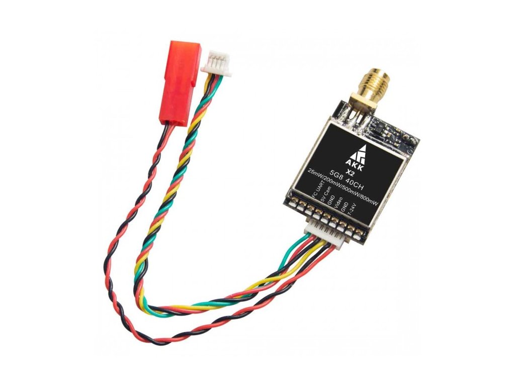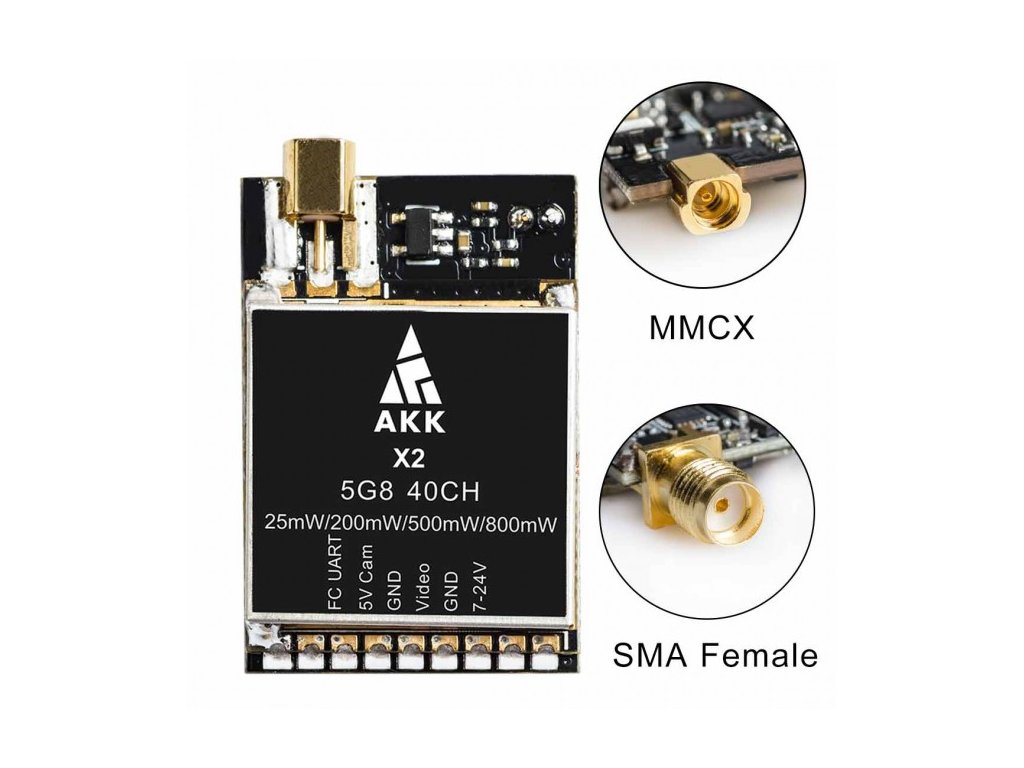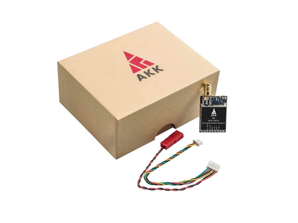 VTX AKK X2-MMCX 5.8G 800mW AKK X2 and X2P are high-quality video transmitters for FPV systems. The ability to set the transmitting power to 0.01mW for “clean” channel switching. Additional 5V BEC for powering low-current systems such as an analog FPV camera, as well as the ability to change transmitter parameters directly through the OSD. Features: - Wide power output range for long range flights - Digital display and button on the body to switch power or frequency - Large input power range from 7 to 24V can provide 5V power for analog camera - Possibility of “clean” switching with a large number of pilots nearby - Smart Audio function. Transmitter parameters can be changed using the radio remote control via OSD when connected to the controller via - UART - When using an RHCP omnidirectional antenna with maximum transmitter power, signal reception is possible at a distance of up to 4 km Specifications: Input voltage: 7 - 24V Extra features: Smart audio, PitMode Frequency: 5.8GHz Number of channels: 40 BEC: 5V for FPV camera (0.3A max) Output power: 25/200/500/800mW Port connector for connecting to FC: 6-pin JST Antenna connector: MMCX Size: 29,8 x 20mm Weight: 7g Package Includes: 1x VTX 1x Сable 1x MMCX Pigtail