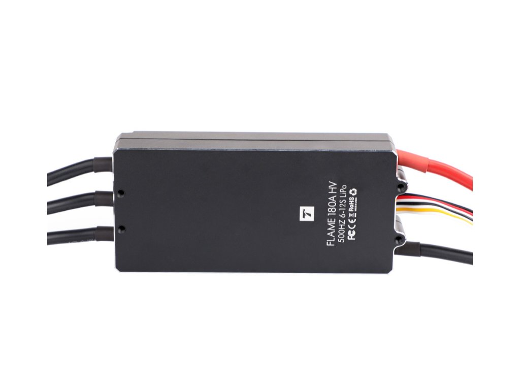 ESC T-Motor Flame 180A 12S Multirotor UAVs T-Motor Flame 180A 12S ESC is a high-performance electronic speed controller designed for multirotor UAVs operating in harsh and demanding conditions. Delivering 180A continuous current and up to 200A peak (10s), it supports 6–12S LiPo batteries and ensures stable, powerful motor control. With IP56 protection, layered heat dissipation structure, and multiple safety protections, it provides reliability and safety for professional drone applications. Features: - High continuous current output for powerful multirotor systems - Supports 6–12S LiPo batteries for flexible power configurations - 180A continuous and 200A peak current capability - Efficient multi-layer structure for optimized heat dissipation - IP56 protection rating for harsh environment operation - Start-up, overload, motor lock-up, and throttle signal loss protection - Supports data feedback for advanced flight monitoring - Common interface design for simple and fast installation - Compatible with T-Motor U12 series motors - Designed for professional UAV and model aircraft applications Specifications: Operating Current: 180A continuous Peak Current: 200A (10 seconds) Operating Frequency: 500Hz / 621Hz Battery Support: 6–12S LiPo Max Voltage: 51.8V Protection Rating: IP56 Length: 106 mm Width: 49 mm Height: 46.8 mm Weight: 279 g Package includes: 1x T-MOTOR FLAME 180A 12S ESC 1x Hardware Kit