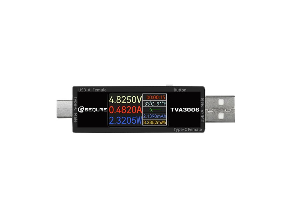 High Precision Volt-Ammeter SEQURE TVA3006 The SEQURE TVA3006 is a compact high-precision volt-ammeter designed for real-time monitoring of voltage, current, and power across a wide range of DC devices. With USB-A and Type-C compatibility, a bright IPS color display, and advanced statistical functions, it offers professional-grade diagnostics in a portable form. Ideal for testing chargers, power banks, adapters, power supplies, and DIY electronics projects. Features: - Supports wide-range voltage and current testing, making it suitable for everything from small electronics to higher-power DC systems. - Measures bidirectional current and works with both USB-A and USB-C interfaces for universal compatibility. - Real-time monitoring of voltage, current, power, capacity, energy, time, temperature, and current direction for complete power analysis. - Features a detailed statistics interface that displays maximum, minimum, and average values of voltage, current, and power. - Equipped with a clear IPS color screen with adjustable viewing direction for flexible placement and easier reading. - Includes a multifunctional user interface with support for firmware upgrades, ensuring long-term usability and improved accuracy. - Ideal for monitoring chargers, power supply devices, USB power lines, and DIY electronic equipment. Specification: Model: TVA3006 Voltage Range: DC 4.5-30V Current Range: 0-15A(Continuous 6A) Interface Specification: USB-A & Type-C Voltage Measurement Accuracy: ±0.01V Current Measurement Accuracy: ±0.01A Screen Specification: 1.14”IPS LCD Monitoring Methods: Pass-through Monitoring Content: Voltage, Current, Power, Work Timekeeping, Temperature, Current Direction, Capacitance, quantity of electricity, and so on. Adjustable Display Direction of Screen: Support Data Statistics: Support Firmware Upgrade: Support Dimension of Host: 80x20x14mm Weight of Host: 18g Package includes: 1x High Precision Volt-Ammeter SEQURE TVA3006