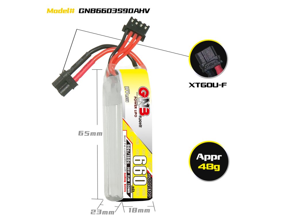 Bateria GNB GAONENG LiHV 3S 11.4V 660mAh 90C XT30 Wysokowydajny akumulator 3S LiHV o napięciu 11,4 V i pojemności 660 mAh, z szybkością rozładowania 90C dla optymalnej mocy wyjściowej. Wyposażony w złącze XT30. Jest kompatybilny z dronami od 1,6 do 2 cali, takimi jak Beta75X, Alpha A75, HGL Petrel 120x, CineBee i 2,5-calowymi dronami Toothpick. Specyfikacje: Pojemność: 660mAh Napięcie: 11.4V (LiHV) Konfiguracja ogniw: 3S1P Wymiary opakowania: 23*18*65mm (wys. * szer. * dł.) Waga netto: 48g (+/-2g) Szybkość rozładowania: 90C Szybkość ładowania: 1C do 5C Złącze ładowania: XH-JST 4P Złącze rozładowania: XT30U-F Pakiet zawiera: 1x Akumulator GNB LiHV 3S 11.4V 660mAh 90C XT30