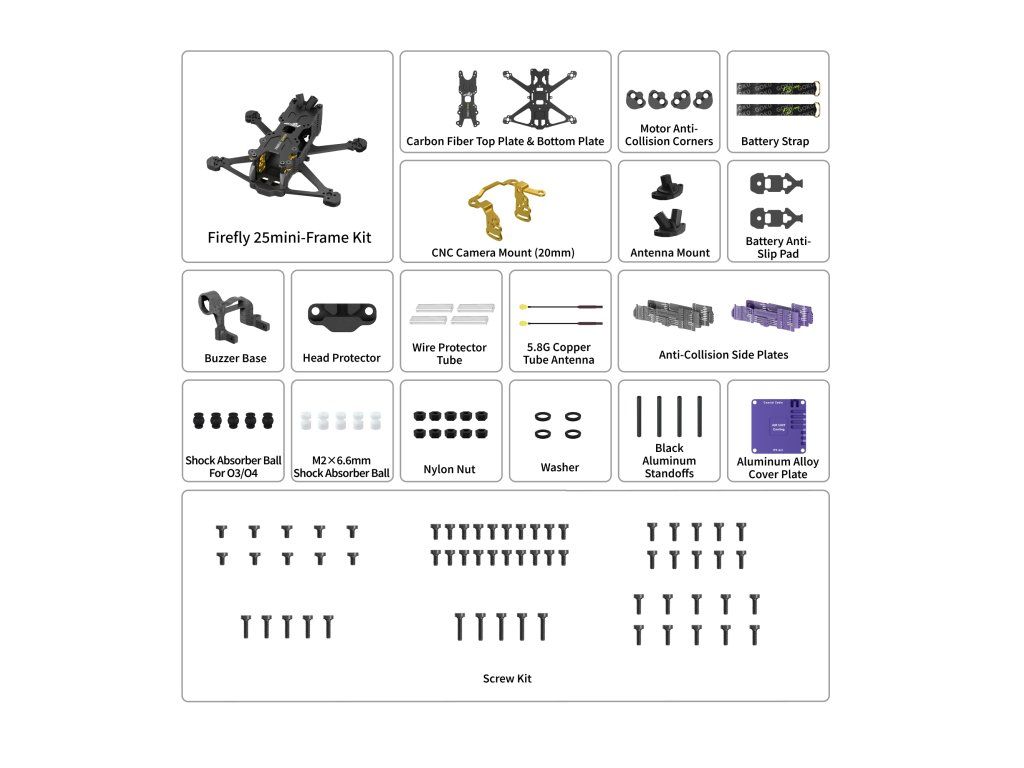 Rama FLYWOO Firefly 25MINI 3S (zestaw ram) Rama FLYWOO Firefly 25MINI 3S to lekka rama z włókna węglowego zaprojektowana dla 2,5-calowych mikro dronów FPV, przeznaczona do długotrwałego latania freestyle'owego i cyfrowego latania w jakości HD. Zbudowana ze wzmocnioną konstrukcją i pogrubioną płytą podstawową, zapewnia doskonałą wytrzymałość przy minimalnej masie całkowitej. Rama obsługuje wiele cyfrowych systemów FPV i umożliwia łatwą instalację oraz wymianę komponentów, co pozwala na elastyczne konfiguracje dronów. Cechy: - Konstrukcja z włókna węglowego o wysokiej wytrzymałości zapewniająca doskonałą sztywność i trwałość - Wzmocniona konstrukcja ramy z pogrubioną płytą podstawową poprawiająca odporność na uderzenia - Konstrukcja platformy o podwójnym formacie umożliwiająca kompatybilność z różnymi konfiguracjami mikro dronów FPV - Pełna kompatybilność z głównymi cyfrowymi systemami FPV HD, umożliwiająca wszechstronne konfiguracje - Regulowany uchwyt kamery pomagający uzyskać optymalny kąt widzenia i stabilny materiał filmowy - System mocowania kamery z izolacją od wstrząsów, redukujący drgania i minimalizujący efekt „jello” - Zdejmowane bez użycia narzędzi osłony boczne, umożliwiające szybki montaż i konserwację - Przejrzysty i praktyczny układ ramy, ułatwiający okablowanie i rozmieszczenie komponentów Specyfikacja: Wymiary: 122x105x33 mm Rozstaw osi: 122 mm Rozstaw mocowania kontrolera lotu: 20x20 mm Rozstaw mocowania nadajnika wideo: 20x20 mm / 25,5x25,5 mm Rozstaw mocowania silnika: 4xM2 (9 mm) Waga: 27 g Zalecane śmigła: 2,5 cala (Gemfan 2520-3) Zalecany kontroler lotu: GOKU F405 SE 3-4S 20A AIO Zalecany silnik: bezszczotkowy silnik ROBO 1303 6000KV Kompatybilne systemy HD: DJI O4 Wide Air Unit, DJI O4 Pro Air Unit, Walksnail Avatar Pro, HDZero Whoop Lite z kamerą Runcam Micro Zalecany odbiornik: Flywoo TCXO 2.4G ELRS EL24P Zalecany akumulator: 3S 550 mAh / 3S 750 mAh / 3S 1000 mAh LiHV Zawartość opakowania: 1x górna płyta z włókna węglowego 1x dolna płyta z włókna węglowego 4x narożniki zabezpieczające silnik przed kolizją 2x paski do akumulatora 1x uchwyt do kamery CNC (20 mm) 2x uchwyt do anteny 2x podkładki antypoślizgowe do akumulatora 1x podstawa brzęczyka 1x osłona złącza 4x rurki ochronne do przewodów 2x miedziane anteny rurowe 5,8 GHz 2x boczne płyty antykolizyjne 5x kulki amortyzujące do O3/O4 5x kulki amortyzujące M2*6 mm 2x antypoślizgowe mocowania akumulatora 10x nakrętki nylonowe 4x podkładki 4x czarne aluminiowe podkładki dystansowe 2x płyty osłonowe ze stopu aluminium 1x zestaw śrub