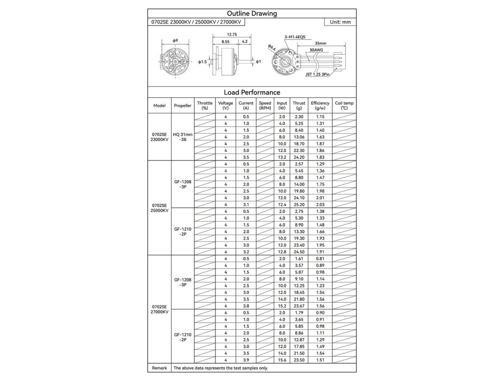 0702SE 23000KV Silniki bezszczotkowe (4 SZTUK) Cechy - Silniki 0702SE są przeznaczone do lekkich dronów o średnicy 65 mm. - Ważą zaledwie 1,42 g, co czyni je najlżejszymi dostępnymi silnikami. - Silnik 0702SE z mosiężnymi tulejami jest bardziej przystępny cenowo i wytrzymały. - Pomimo dostępności większych silników osiągających podobny ciąg, silniki 0702 są preferowane ze względu na ich zdolność do zmniejszenia masy z dala od środka ciężkości, co zwiększa zwinność. - Śruby PEEK, ważące zaledwie 0,10 grama/12 sztuk, przyczyniają się do oszczędności masy i oferują odporność na ciepło, tarcie, wstrząsy i zmęczenie. - W połączeniu z 2-łopatowymi śmigłami Gemfan 1210 lub 3-łopatowymi 1208, silniki te zapewniają solidną moc i szybkość reakcji, spełniając wymagania lekkich instalacji dronów whoop. Specyfikacja Pozycja: Silniki bezszczotkowe 0702SE Łożysko: Tuleje mosiężne KV: 23000KV Waga: 1.42g±0.03g Waga bez złącza: 1,35 g Kolor: niebieski lodowy Średnica wału: 1 mm Długość wału: 4,2 mm Odległość między otworami: 6,6 mm Otwory montażowe silnika: M1.4 Napięcie wejściowe: 1S Kable: 35mm wraz ze złączem, kable 30AWG Wymiary: 12,75*φ9mm Zalecane części Śmigła: GF 1210 2B Props, GF 1208 3B Props Rama: Rama Meteor65, rama Meteor65 Pro FC: Bezszczotkowy kontroler lotu F4 1S 5A AIO Akumulator: BT2.0 300mAh 1S 30C (8szt.) Śruby: Zestaw śrub mocujących silnik serii Meteor Pakiet 4 * Silnik bezszczotkowy 0702SE 23000KV 15 * śruby M1.4*3 PEEK 12 * Śruby metalowe M1.4*3