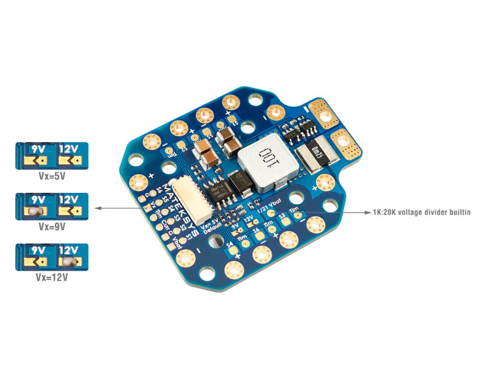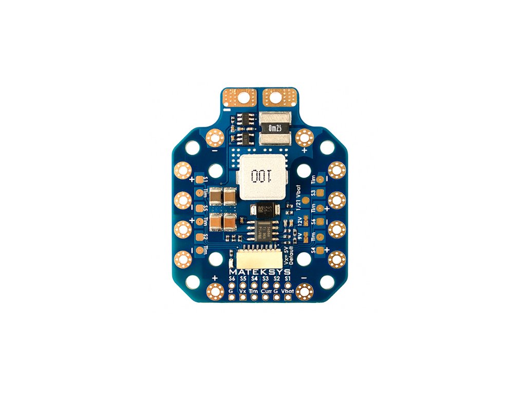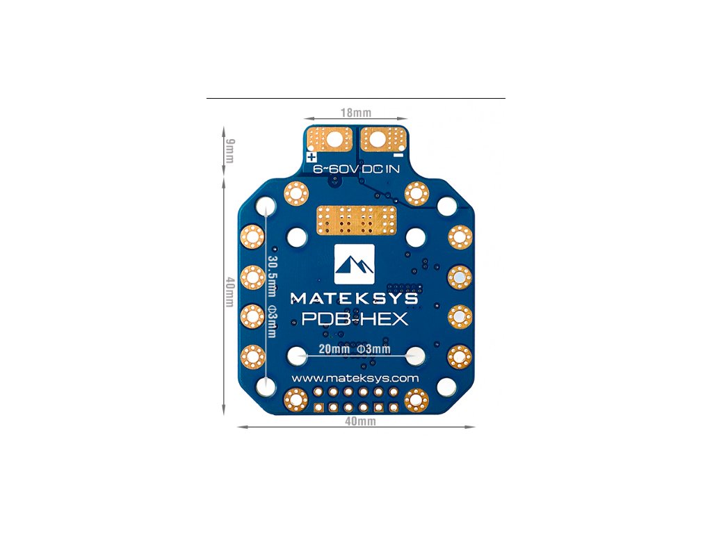 Płytka dystrybucji zasilania MATEKSYS PDB-HEX MATEKSYS PDB-HEX to sześciokątna płytka dystrybucji zasilania zoptymalizowana pod kątem heksakopterów i quadkopterów, oferująca solidne wykrywanie prądu i regulowany BEC, aby zapewnić niezawodne zasilanie i telemetrię w kompaktowych konfiguracjach FPV. Cechy: - Obsługuje szeroki zakres wejściowy (2–12S LiPo, 6–60 V DC) z wbudowanym czujnikiem prądu. - Rozdziela zasilanie do sześciu ESC z obsługą sygnału telemetrycznego poprzez zintegrowane pady. - Zawiera funkcje ochronne: zabezpieczenie przed przetężeniem, tolerancję na zwarcia i samoczynne przywracanie. - Kompaktowa konstrukcja montażowa. Specyfikacje: Napięcie wejściowe: 6–60 V (2–12S LiPo) Prąd: PDB/rezystor wykrywania prądu: 140 A ciągły, 264 A impulsowy. Każda płytka ESC: 60 A ciągły, 100 A impulsowy. Czujnik prądu: zakres 264 A, wyjście ADC 3,3 V; skalowanie: 125 (INAV/Betaflight), 80 (ArduPilot). Wyjście BEC (Vx): -5 V domyślnie (5 A ciągłe) -9 V lub 12 V poprzez zworkę (4 A ciągłe, maksymalnie do 5 A) -Odporność na zwarcie przez 1 sekundę, zabezpieczenie przed przetężeniem, automatyczne przywracanie. Dzielnik napięcia: rezystory 1 kΩ : 20 kΩ, wyjście = 1/21 VBAT. Fizyczne: Otwory montażowe 30,5 x 30,5 mm i 20 x 20 mm (Ø3 mm) Wymiary 49 x 40 x 6 mm Waga: 12 g Zawartość opakowania: 1x MATEKSYS PDB-HEX PDB z BEC i czujnikiem prądu 1x kondensator Rubycon ZLJ 63 V 390 µF 1x kabel 8-pinowy JST-SH1.0 (5 cm) 2x złącza 8-pinowe JST-SH1.0