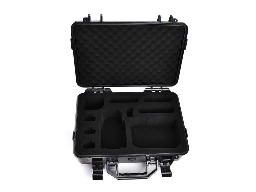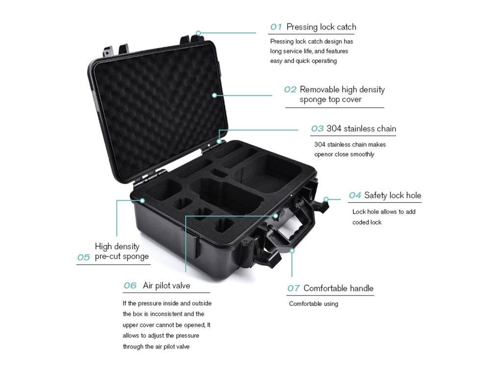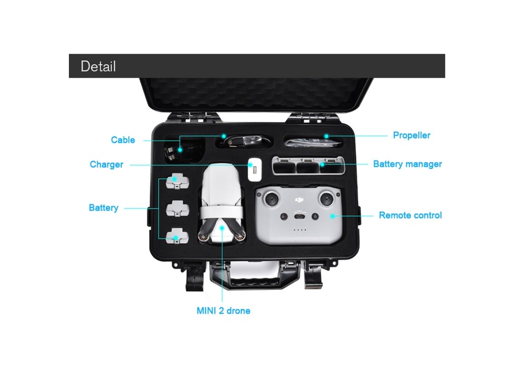 Etui jest specjalnie zaprojektowane dla DJI Mini 2 SE, Mini 2 (z pilotem zdalnego sterowania RC-N1). Wykonany jest z materiału ABS, wodoodpornego i wytrzymałego. Wewnątrz futerału znajduje się gąbka o dużej gęstości dla lepszej ochrony drona i akcesoriów. Walizka może pomieścić drona, pilota zdalnego sterowania, 3 baterie, koncentrator baterii, ładowarkę, śmigło i kable.