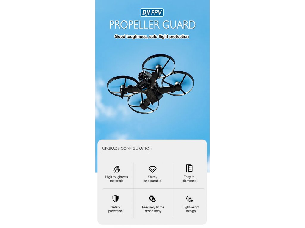 . Osłona śmigieł dla DJI FPV Te osłony śmigieł są specjalnie zaprojektowane dla DJI FPV. Wykonane są z wysokiej jakości nylonu, który pochłania wstrząsy i jest odporny na uderzenia. Jest lekka i łatwa w montażu lub demontażu. Odporna na wstrząsy osłona chroni śmigła bez wpływu na wydajność lotu. Osłona śmigła jest idealna do bezpiecznych lotów w pomieszczeniach lub podczas lotów treningowych. Kompatybilność: dla DJI FPV Materiał: Nylon Rozmiar produktu: 145x145mm Waga netto: 82g