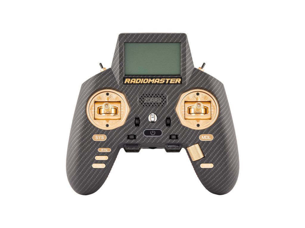. Zorro MAX ELRS Kontroler radiowy RadioMaster Zorro Max jest wyposażony w niestandardowe anodyzowane AG01 w pełni aluminiowe gimbale Halla CNC o niesamowitej trwałości i znacznie gładszym wyczuciu niż V3. Cztery unikalne opcje kolorystyczne zapewniają elegancki wygląd, o którym mówią wszyscy w branży. To radio jest również wyposażone w skórzane uchwyty, które zapewniają lepszy uchwyt podczas lotu FPV! Pozycja: Kontroler radiowy Zorro Max Wersja: ELRS Region: LBT Kolor: Złoty Uwaga: Wersja ELRS LBT (Europa) jest wstępnie zainstalowana z domeną ExpressLRS CE EU LBT FW (ograniczona do 100 mw mocy wyjściowej). Specyfikacja: Gimbale: AG01 MINI Gimbals Wymiary fizyczne: 170*159*108mm Waga: 350 gramów Częstotliwość pracy: 2.400GHz-2.480GHz Wewnętrzne opcje RF: 4-w-1 multi-protokół / ELRS Obsługiwane protokoły: Zależny od modułu / ELRS Moc RF: 4-w-1: 20dBm maks. ELRS: do 250mw (dostępne będą wersje CE i FCC) Wzmocnienie anteny: Składana 2db Prąd operacyjny: 160mA@8.4V Napięcie robocze: 6,6-8,4 V DC Odległość sterowania: 4-w-1:> 2km @ 20dbm / ELRS: Zależnie od odbiornika i mocy wyjściowej System operacyjny: Kompatybilny z OpenTX / EdgeTX Kanały sterowania: Maksymalnie 16 (w zależności od Rx) Wyświetlacz: 128*64 Monochromatyczny LCD Bateria: 2 x 18350 (brak w zestawie) Ładowanie: Wbudowane ładowanie USB-C Wnęka na moduł: Rozmiar Nano (kompatybilny z TBS Nano Crossfire / Nano Tracer / IRC Ghost) Metoda aktualizacji oprogramowania układowego: Przez USB lub kartę SD