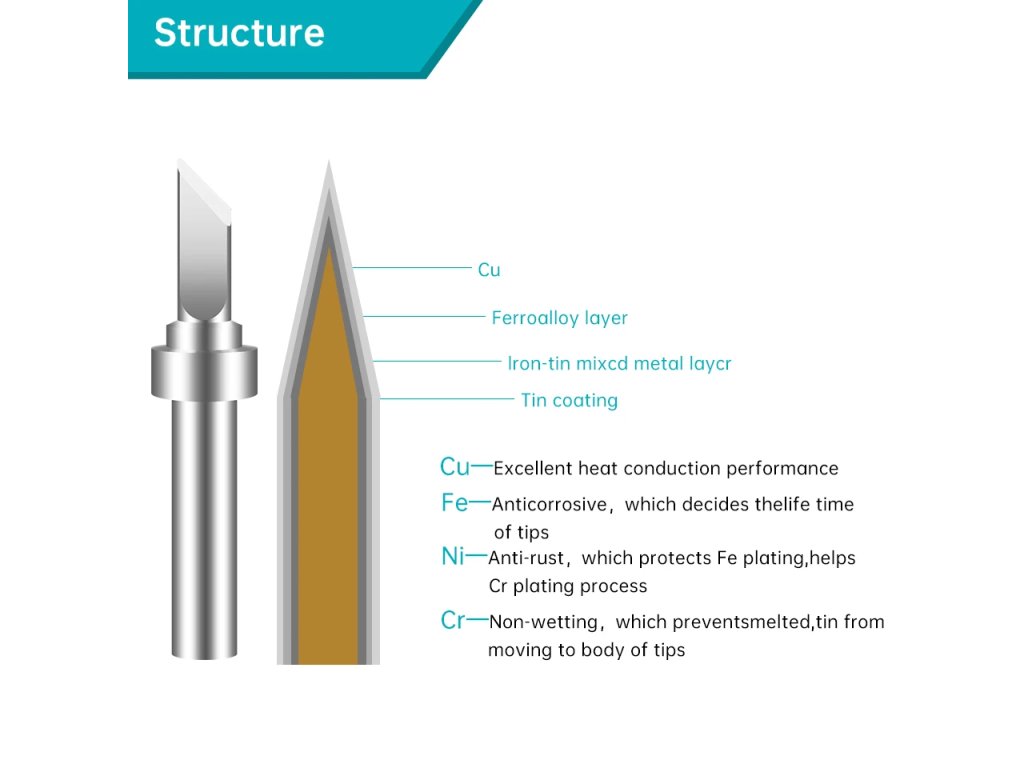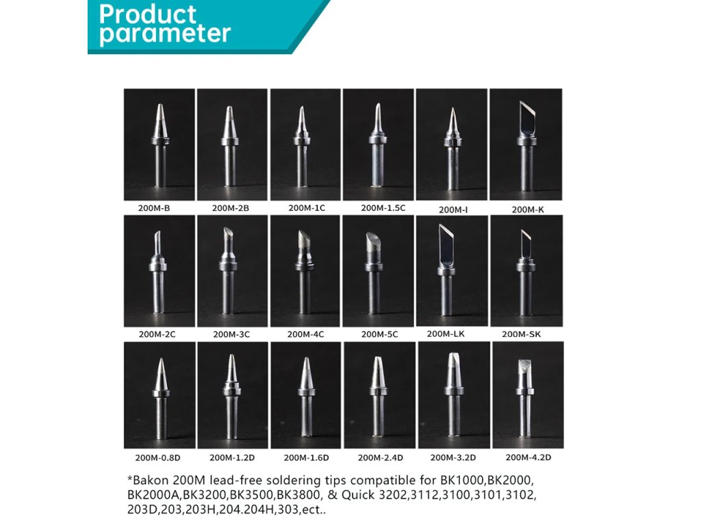 Hrot pájecího pera Bakon 200M-3C Hrot Bakon 200M-3C pro pájecí stanice je vyroben z bezkyslíkaté mědi, která je šetrná k životnímu prostředí a odolná proti korozi. Speciální úprava zajišťuje vynikající předpocínování, hladké pájení a silnou odolnost proti oxidaci. Povrch je ošetřen bezolovnatým galvanickým pokovováním pro dlouhou životnost. Specifikace: Teplotní rozsah: 200–480 °C Kompatibilní pájecí stanice: 1000/2000S Typ: 200M-3C Průvodce výběrem hrotu: K typ: Univerzální hrot nožového tvaru vhodný pro lokální nebo vertikální pájení. Ideální pro SOJ, PLCC, SOP, QFP, napájecí uzemnění, opravy cínových mostů a konektory. B typ: Štíhlý hrot pro použití v těsných prostorech nebo kolem vysokých komponentů. Vhodný pro obecné pájení bez ohledu na velikost bodu. I typ: Jemný špičatý hrot pro přesné pájení v malých oblastech nebo pro opravy cínových mostů na čipech. C typ: Hrot se skloněnou plochou, ideální pro pájení vyžadující velké množství cínu. Vhodný pro rozsáhlé oblasti, silné terminály a velké pájecí spoje. D typ: Určený pro hromadné pájení s vyšší potřebou cínu. Obsah balení: 1x Hrot pájecího pera Bakon 200M-3C