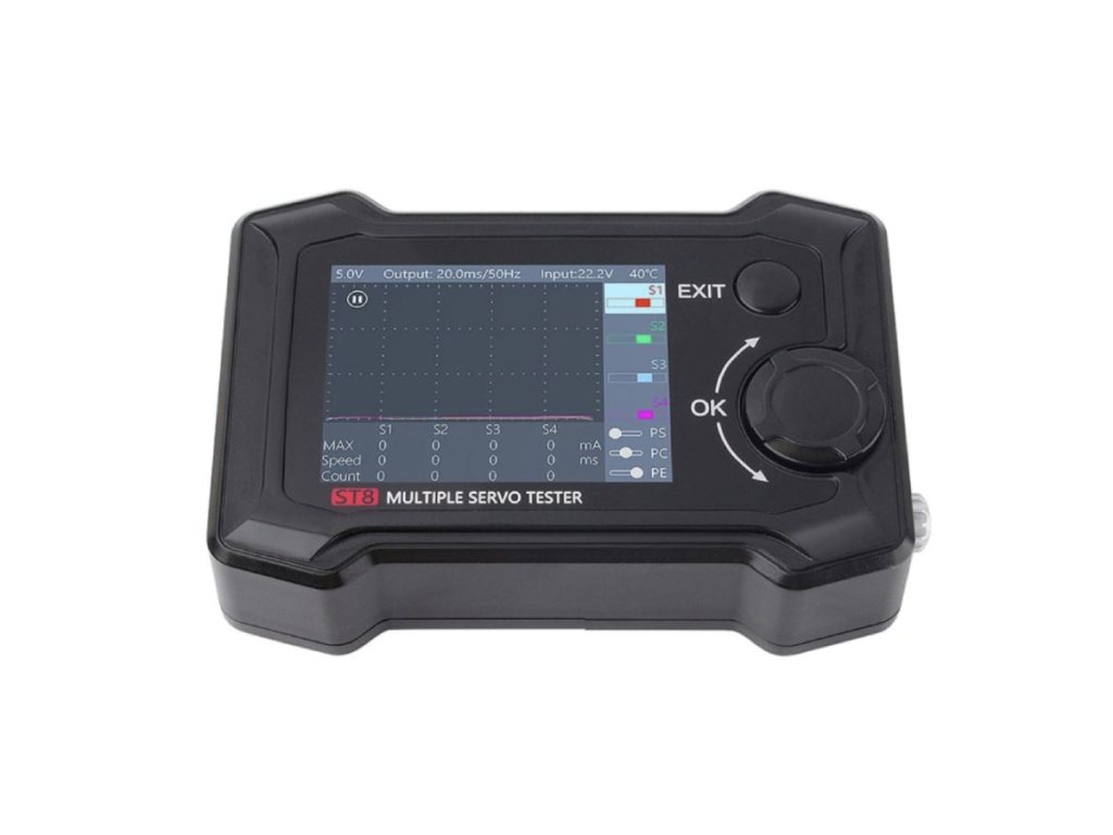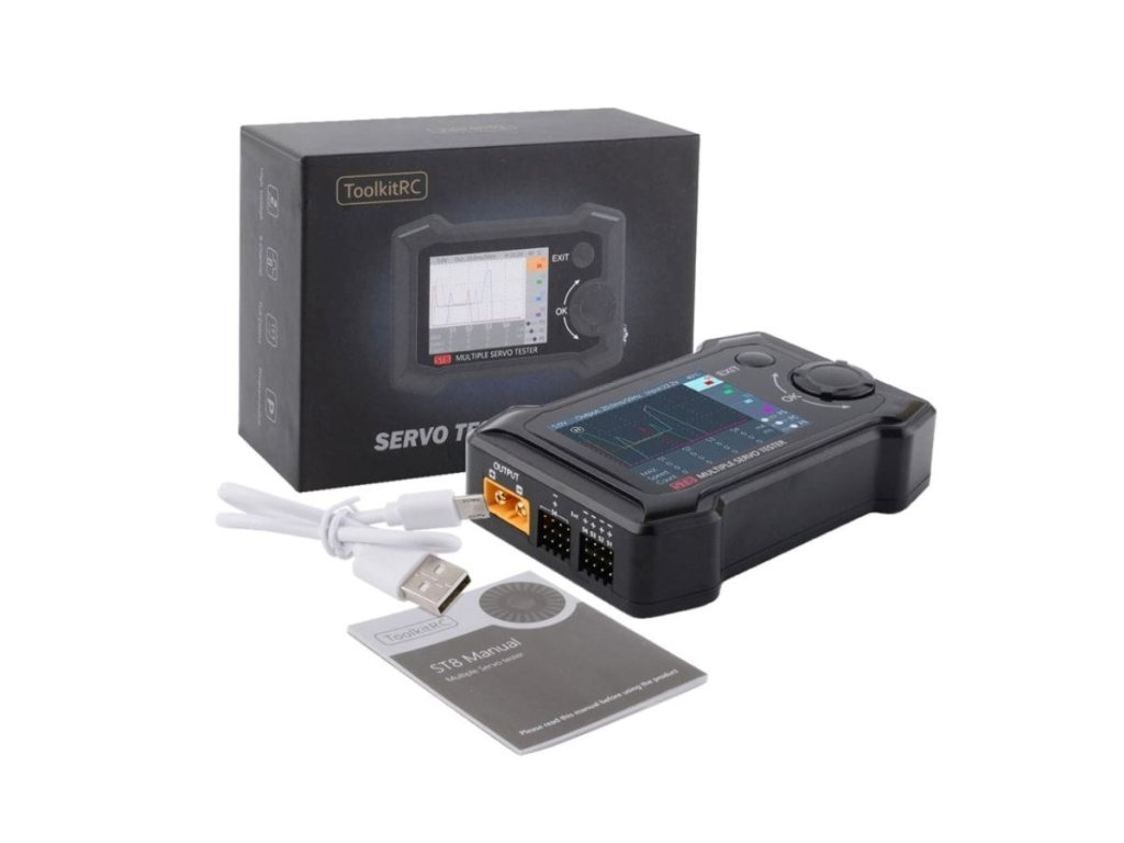 Pokročilý servo tester ST8 Pokročilý tester serv ToolkitRC ST8 umožňuje testovat až 8 serv současně přes 4 nezávislé výstupní kanály. Funkce: - 4 kanály programovatelného nezávislého signálu, 8 kanálů výstupního signálu, přesnost 1 ms - 4 nezávislé měření proudu, resp. zobrazení křivky - Více režimů měření (rychlost, počet, krok, lineární) - Výstupní signály PWM s periodou 33 až 1000 Hz - Různé zdroje spouštění signálu (interní, tlačítka, knoflíky, externí zdroje) - Změřte rychlost odezvy převodky řízení s přesností na 1 milisekundu - Externí vstupní signál podporuje PWM/PPM/SBUS s přesností 1 ms - Externí vstupní signál podporuje PWM/PPM/SBUS s přesností 1 ms - Servo pohánějte maximálním zatížením 100W - Vícejazyčný systém - Zařízení je simulováno jako USB flash disk umožňující upgrade firmwaru Specifikace: - 7,0-28,0V @MAX 10A - 5,0V-28,0V@MAX 10A - 5,0V-8,4V@MAX 4A/S1-S4 - 5,0V-8,4V@MAX 4A/S4 Ext. - 100us-2900us@33-1000Hz @S1-S4 - PWM 500us-2500us@S5 - PPM 8CH@S5 SBUS 16CH@S5 - 1000us-2000us@P1 - Upgrade@USB3.0 - 2,4" TFT RGB rozlišení 320*240 - 99 mm * 68 mm * 26 mm - 120 g Zahrnuta: 1x ToolkitRC ST8 Advanced Servo Tester