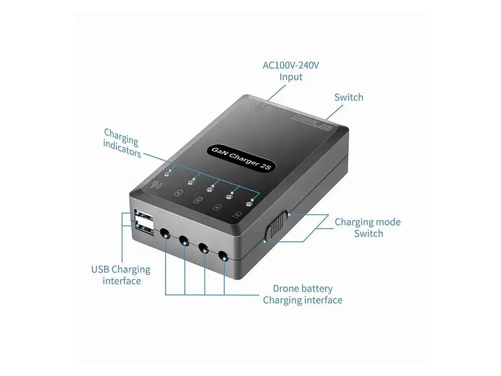 6-v-1 GaN inteligentní nabíječka baterií pro DJI Mavic Air 2/2S (EU Plug) Vyrobeno z GaN (gallium nitridu) polovodičového materiálu třetí generace, který zajišťuje vysoké napětí, vysokou frekvenci a stabilní výkon. Kompaktní a lehký design ve srovnání s jinými nabíječkami se stejným výkonem. Vybaveno funkcemi ochrany proti přepětí, nadproudu, přehřátí, přebíjení a dalšími ochrannými funkcemi. Má dva režimy nabíjení: režim plného nabití nebo režim udržovacího nabíjení. Lze nabíjet až čtyři baterie najednou. Nabíječku můžete snadno zapnout/vypnout bez vytahování napájecího kabelu. Specifikace: Kompatibilita: pro DJI Mavic Air 2/2S Materiál: ABS Čistá hmotnost: 232 g Celková hmotnost: 394 g Velikost produktu: 121 x 72 x 33 mm Vstup AC portu: AC 100V-240V 50/60HZ, 1,5A MAX Výstup 1: DC Výstup 13,2V/2Ax4 Výstup 2: USB Výstup 5V/2.1Ax2 Okolní teplota nabíjení: 7-40°C Verze: EU Plug